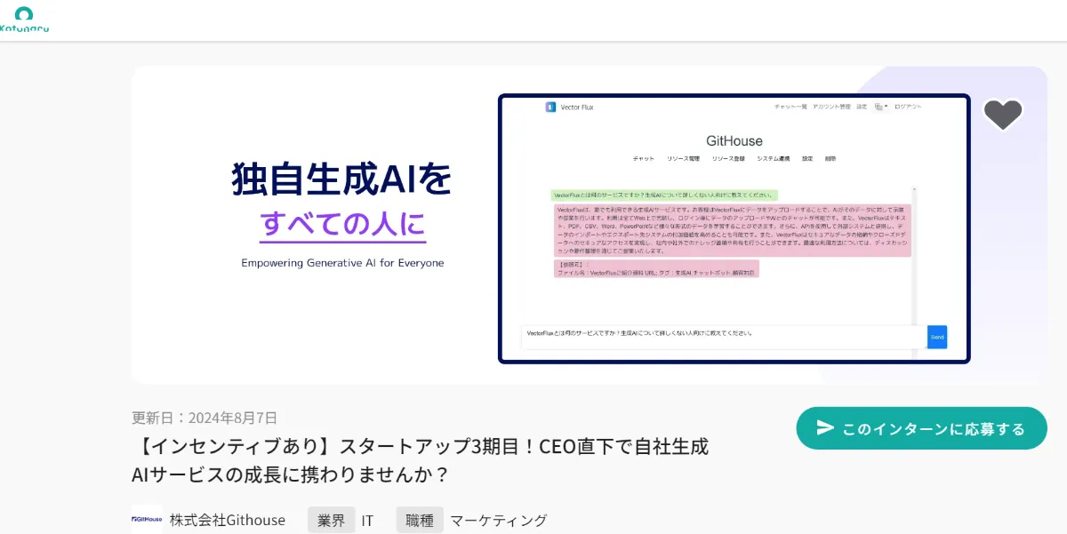 株式会社GitHouse(以下、GitHouse)は、完全オンラインインターン検索サイト「コトナル」https://kotonaru.co.jp/(以下、Kotonaru)にてインターンの募集を開始しました。本募集は、GitHouseの自社生成AI「VectorFlux」「VectorFlux For Writing」、「VectorFlux for Sales」の開発に参画する機会を提供させて頂く形となります。