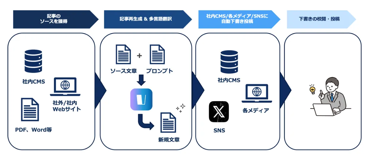 生成AIが記事のたたき台を作成し、各メディアや媒体、SNSへの自動下書き投稿を行います。