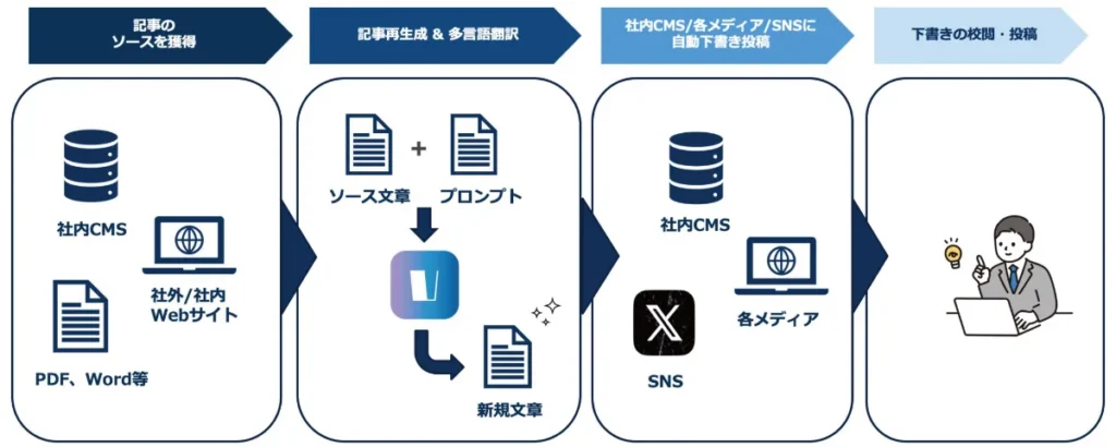 ユーザーは単に参照となるURLやファイルを指定するだけで、生成AIが関連するコンテンツを自動で生成し、翻訳を施した後、指定のメディアやSNSに自動で投稿します。これにより、コンテンツの生産性と到達範囲が大幅に拡大します。